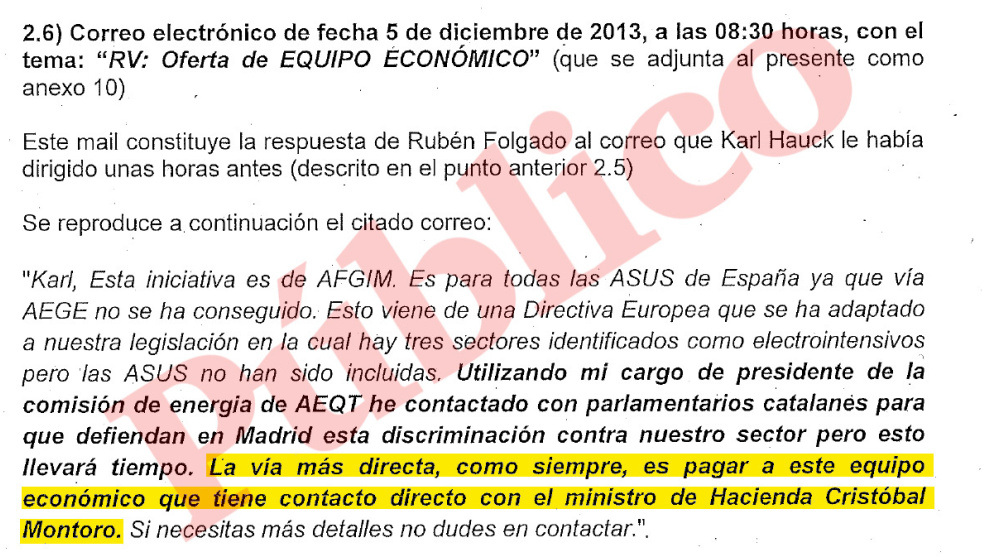 La trama empezó a asomar la cabeza este miércoles, tras siete años de pesquisas en secreto y sin el respaldo de Anticorrupción. Todo empezó en 2018. El juez instructor investigaba entonces la construcción de una planta de Messer Ibérica de Gases en el Ayuntamiento de Morell (Tarragona). El caso dio un giro radical cuando los Mossos encontraron una serie de correos electrónicos en los que los directivos de esta y otras empresas del sector hablaban de su estrategia para conseguir rebajas fiscales en el impuesto eléctrico, entonces en vías de tramitación. Los mismos altos cargos coincidían al señalar a dónde tenían que acudir para asegurar la satisfacción inmediata de sus pretensiones. "La vía más directa, como siempre, es pagar a este Equipo Económico que tiene contacto directo con el ministro de Hacienda Cristóbal Montoro", consta en uno de los mensajes que se citan en el informe policial, al que ha tenido acceso Público.