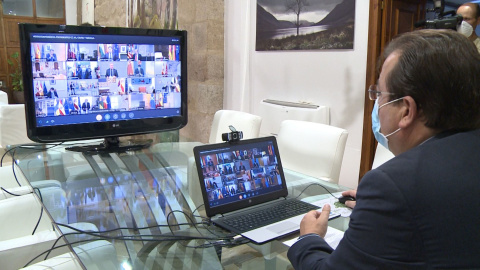 Imágenes del presidente de la Junta de Extremadura, Guillermo Fernández Vara, durante la videoconferencia que el presidente del Gobierno de España, Pedro Sánchez, mantiene con los presidentes de los gobiernos autonómicos.
