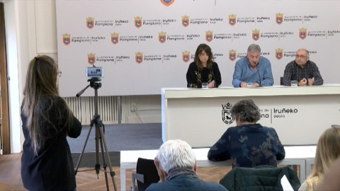 Imágenes del candidato de EH Bildu a la Alcaldía de Pamplona, Joseba Asiron, quien ha comparecido junto a miembros del grupo municipal para informar de las gestiones en la búsqueda de un gobierno en la ciudad.