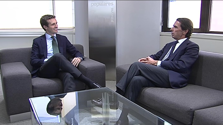 Imágenes del nuevo presidente del PP, Pablo Casado, quien se ha reunido este martes con el expresidente del Gobierno y exlíder de la formación José María Aznar en la sede del partido de la calle Génova.