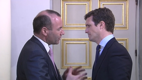 Imágenes del encuentro del presidente del PP, Pablo Casado, con el líder parlamentario del PPE y candidato a la presidencia de la Comisión Europea, Manfred Weber.