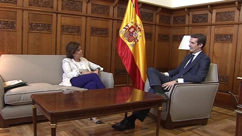 Reunión del presidente del PP, Pablo Casado, con la exvicepresidenta del Gobierno, y su ex rival en las primarias, Soraya Sáenz de Santamaría, en el Congreso de los Diputados.