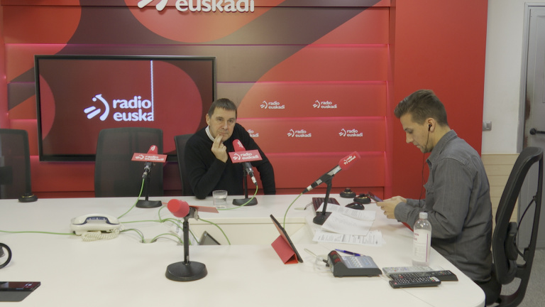 Imágenes del coordinador general de EH Bildu, Arnaldo Otegi, en una entrevista radiofónica en Bilbao.