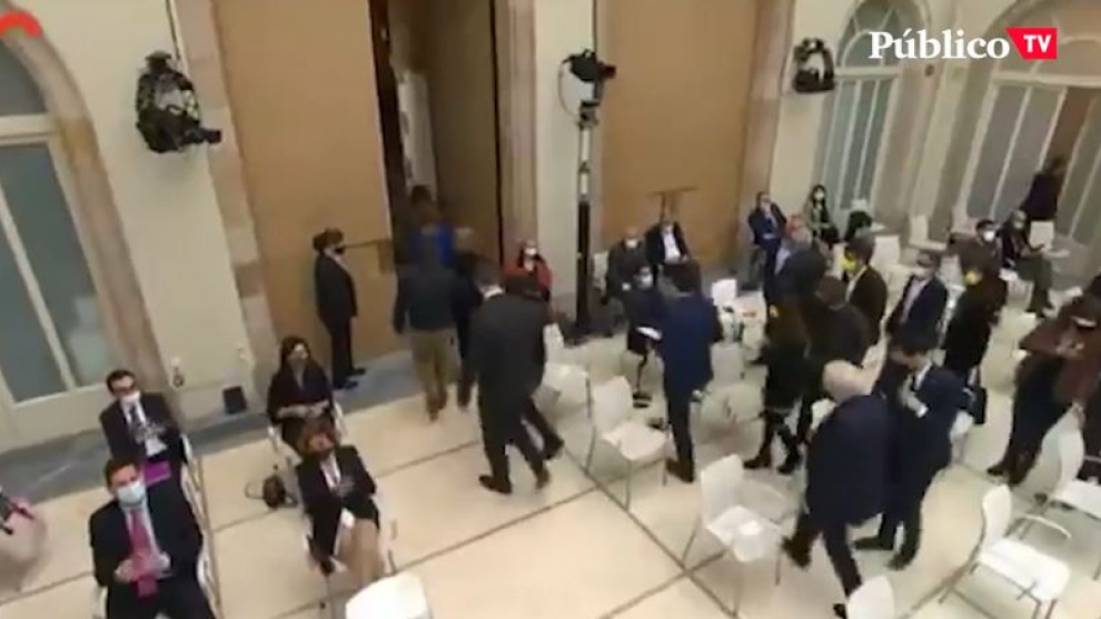 En el momento en el que Ignacio Garriga (Vox), tenía que tomar la palabra, diputados de ERC, Junts per Cat, CUP y comuns han abandonado el pleno del Parlament.