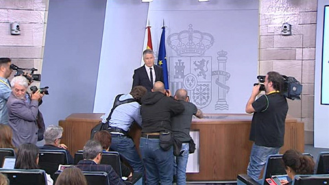 Imágenes del ministro del Interior, Fernando Grande-Marlaska, en rueda de prensa desde el Palacio de Moncloa tras la reunión del gabinete de seguimiento de la situación en Cataluña.