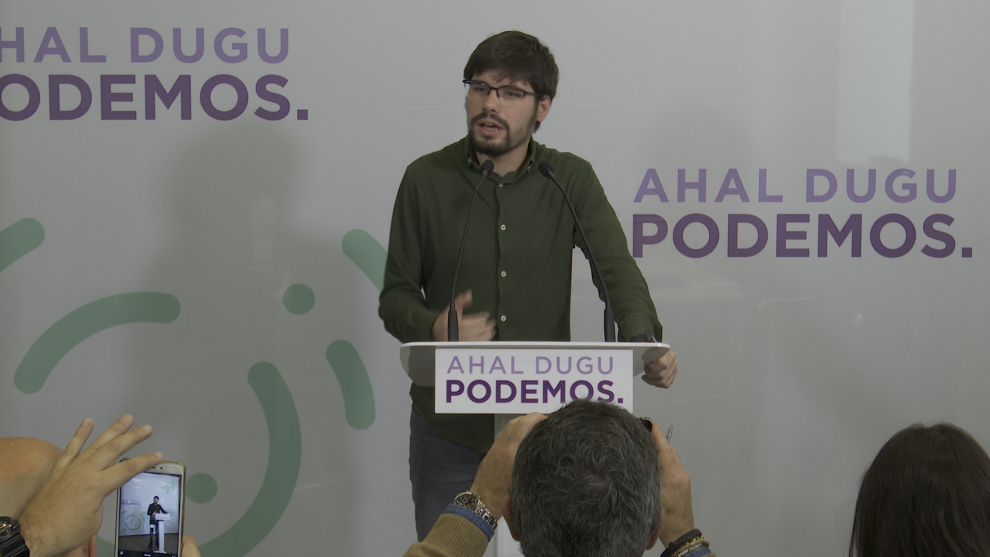 Imágenes del secretario general de Podemos Euskadi, Lander Martínez, en rueda de prensa en Bilbao.