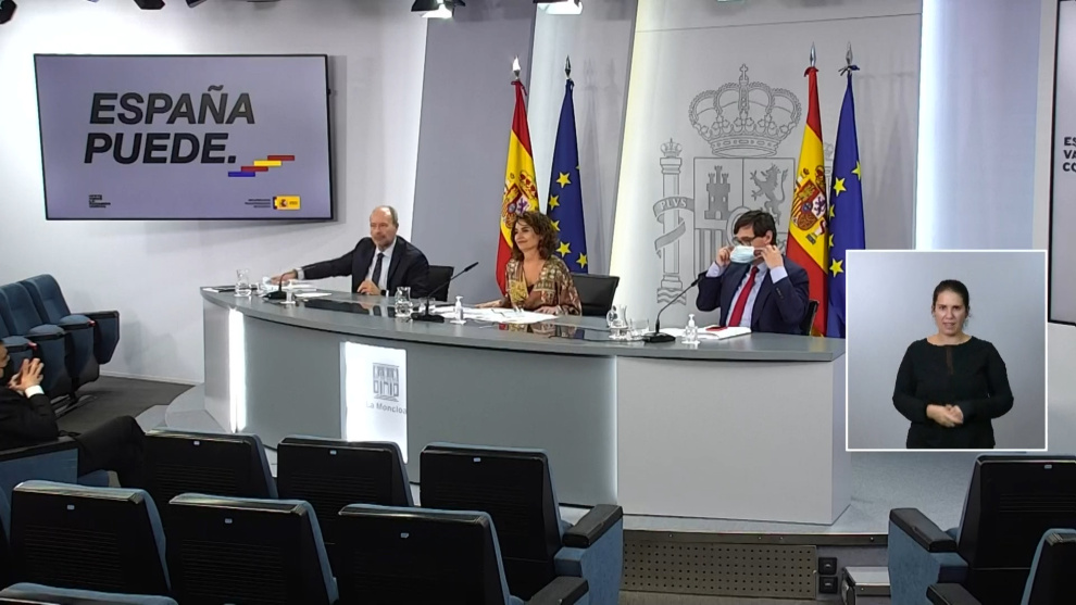 Imágenes de la portavoz del Gobierno, María Jesús Montero, del ministro de Justicia, Juan Carlos Campo y del ministro de Sanidad Salvador Illa, en la rueda de prensa posterior al Consejo de Ministros.