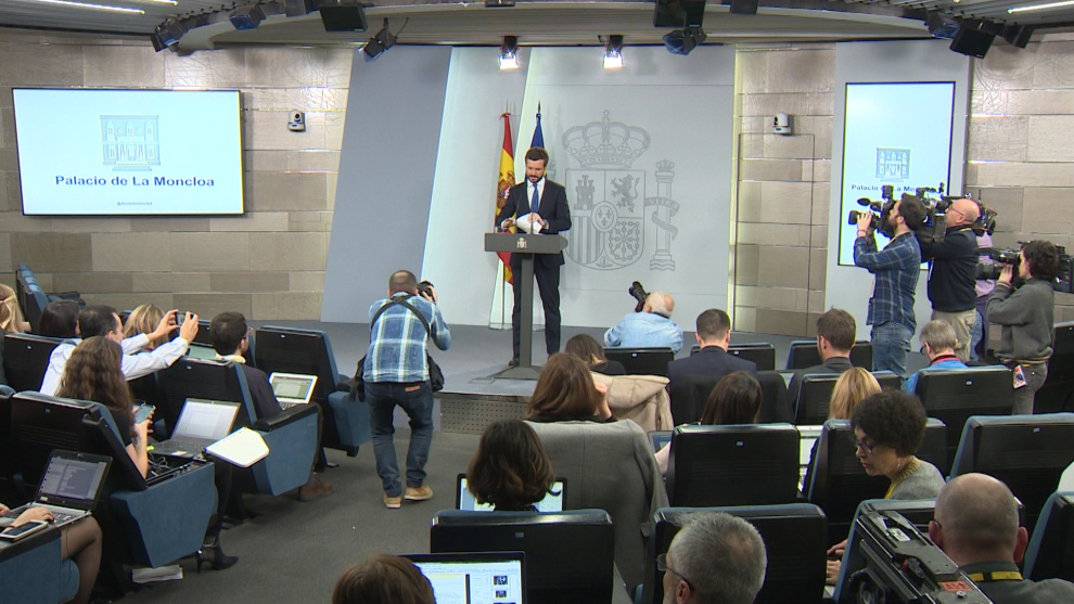 Imágenes del presidente del PP, Pablo Casado, en rueda de prensa.