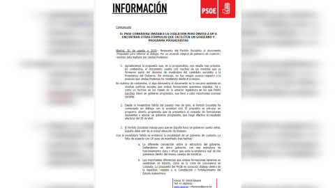 El PSOE rechaza la propuesta realizada esta mañana por Unidas Podemos (UP) de un Gobierno de coalición. Así lo afirma el partido en un comunicado oficial que acaba de hacer público. En este texto precisa que es "inviable" la coalición, pero invitan al partido 'morado' a encontrar fórmulas que faciliten un Gobierno y un programa progresistas.
