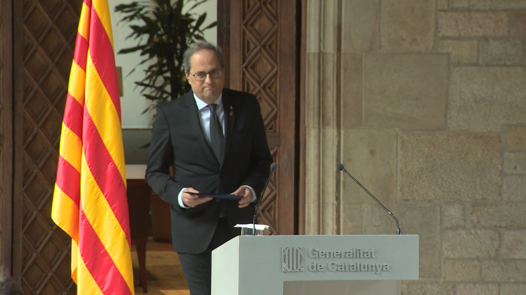 Imágenes del presidente de la Generalitat, Quim Torra, durante su comparecencia en el Palau de la Generalitat.