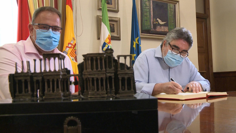 Imágenes del encuentro que han mantenido la mañana de este jueves el ministro de Cultura y Deporte, José Manuel Rodríguez Uribes, y el alcalde de Mérida, Antonio Rodríguez Osuna, en el consistorio emeritense.