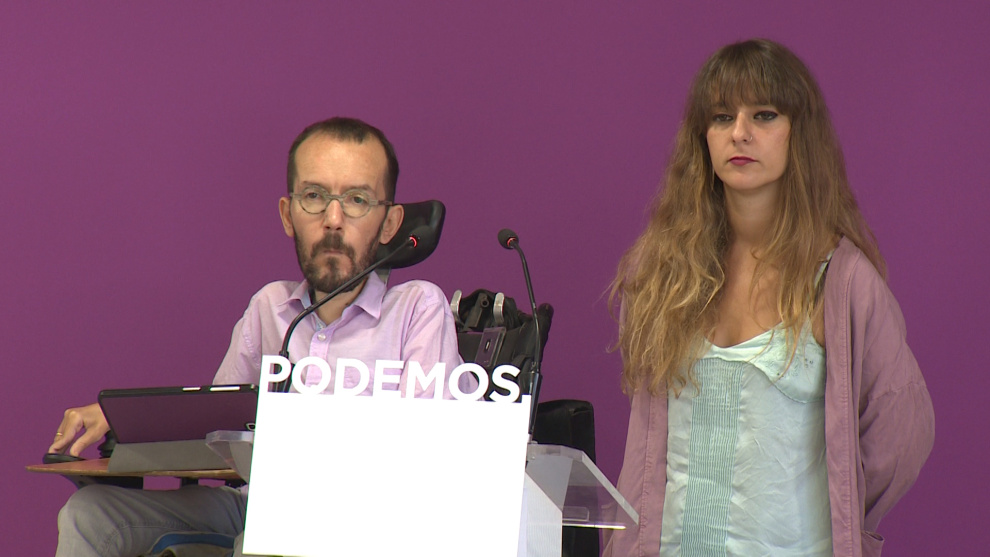 Imágenes del responsable de organización de Podemos, Pablo Echenique y de la portavoz de la formación morada, Noelia Vera, en rueda de prensa tras el Consejo de Coordinación de Podemos.