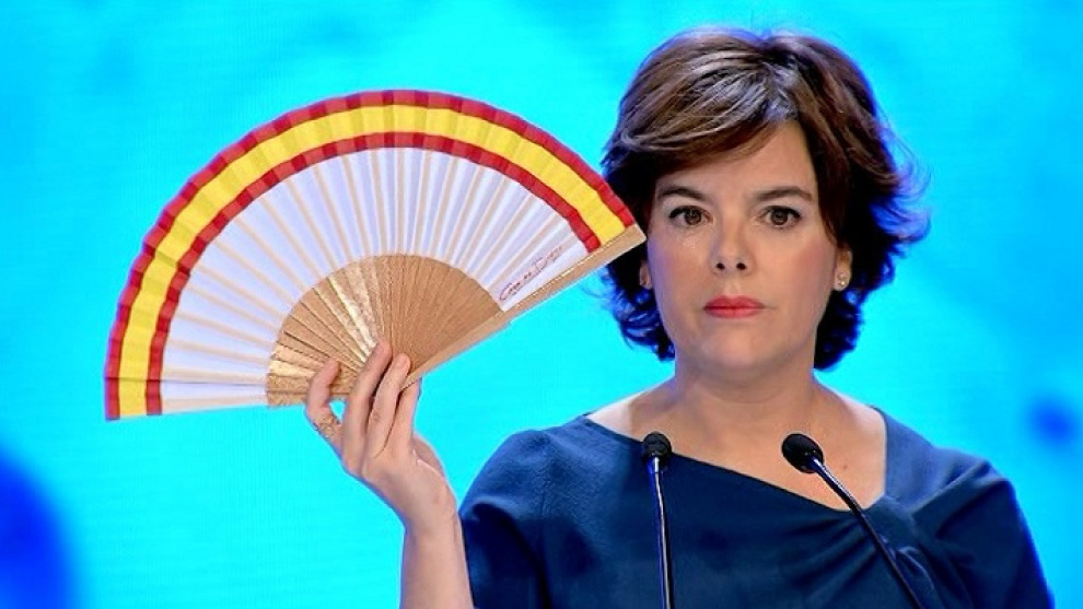 La candidata a presidir el Partido Popular Soraya Sáenz de Santamaría ha ilustrado su proyecto para el partido con un abanico con los colores de la bandera de España.