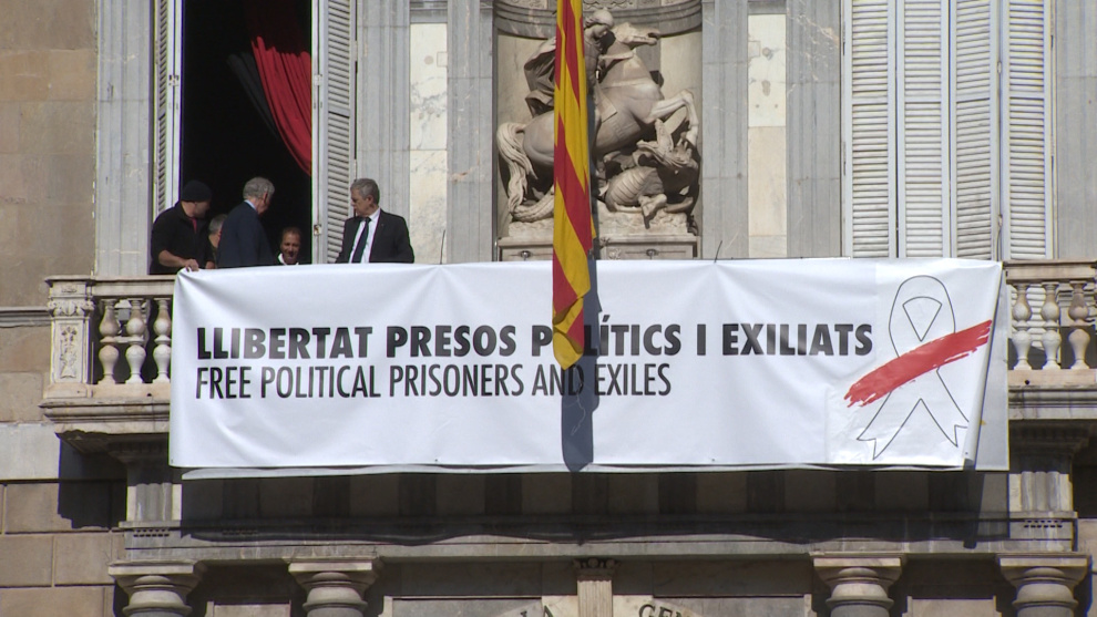 La Generalitat ha retirado sobre las 10.30 horas de este jueves la pancarta con el lazo amarillo que colgaba de su fachada, que la Junta Electoral Central (JEC) ordenó retirar, y ha colocado otra con el mismo lema en recuerdo de los líderes independentistas presos, pero con un lazo de color blanco.