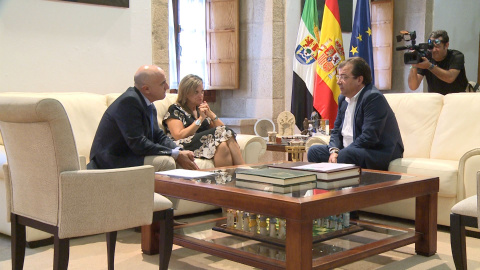 Imágenes de la reunión que ha mantenido el presidente de la Junta de Extremadura, Guillermo Fernández Vara, con el presidente de la Confederación Hidrográfica del Guadiana, Samuel Moraleda Ludeña, y la delegada del Gobierno en la región, Yolanda García Seco.