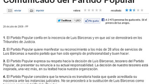 La web del PP mantiene la nota de apoyo a Bárcenas