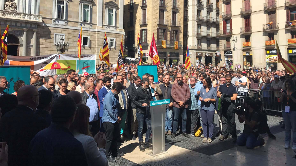 Amb tota la sensibilitat que aquest moment històric representa, centenars de persones a favor de la convocatòria del referèndum s'han concentrat a plaça Sant Jaume. Allà, les entitats sobiranistes havien convocat un acte transversal "per defensar la democràcia" en paraules d'Eulàlia Solé, d'Òmnium Cultural i en repulsa pels registres i detencions que la Guàrdia Civil està duent a terme des d'aquest matí.
