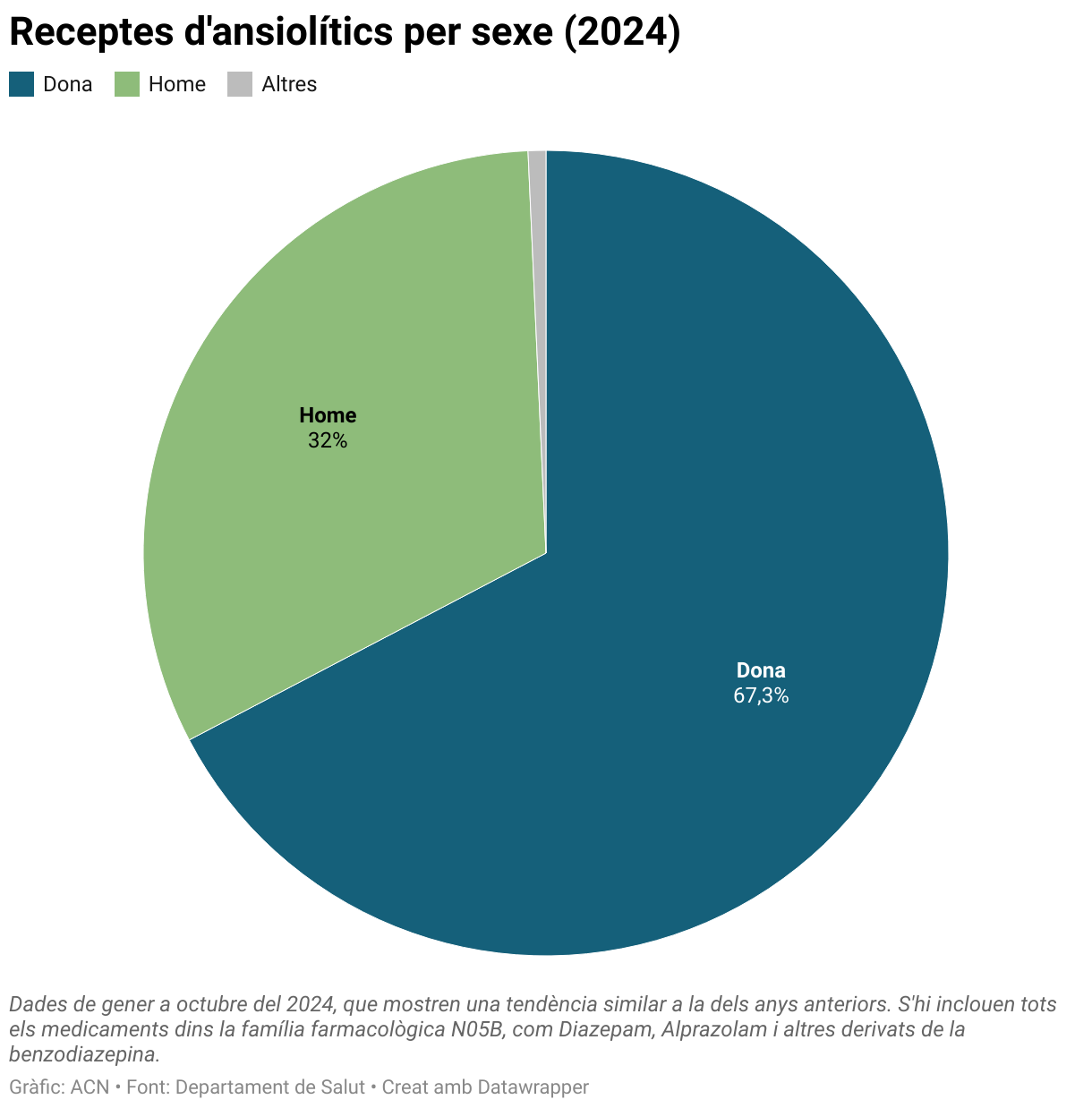 La distribució dels 5,5 milions de receptes d'ansiolítics és desigual segons el gènere. Les dones concentren 3,75 milions de receptes, gairebé un 68% del total, mentre que els homes n’han rebut 1,78 milions, poc més del 32% del conjunt de la ciutadania. Tant Miravet com el també metge de família i vocal de la Societat Catalana de Medicina Familiar i Comunitària (CAMFiC), Jordi Mestres, defensen que la dona sempre ha tingut més facilitat per parlar dels seus problemes de salut mental. La doctora creu que més consultes als CAP porten a més receptes, confirmant que les dones “no tenen tanta resistència” a parlar de situacions d’ansietat, estrès o de son.