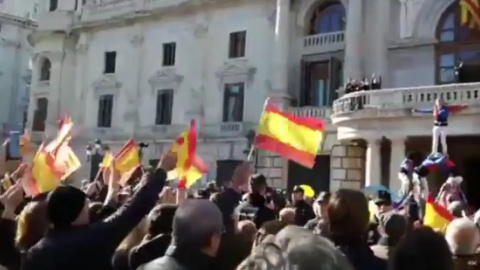 Allà, membres de l'extrema dreta, convocats en els últims dies a través de missatges per whatsapp, han xiulat, cantat el "Cara al Sol" i han cridat "fora" mentre brandaven banderes valencianes i espanyoles. Al mateix temps, els assistents aplaudien la cavalcada i l'aclamaven amb crits de "Visca les reines magues".