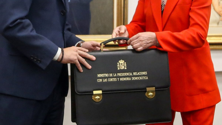 Carmen Calvo, que fins aquest mes de juliol era vicepresidenta primera i ministra de la Presidència, Relacions amb les Corts i Memòria Democràtica del Govern de Pedro Sánchez, lliura la seva cartera ministerial a Félix Bolaños.- EUROPA PRESS