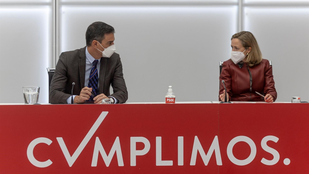 Pedro Sánchez i Nadia Calviño reunits amb l'equip econòmic del Govern a la seu del PSOE -- Rodrigo Jiménez / EFE