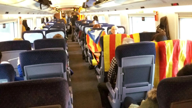 Viatjar a bord de l'ICE 19, que havia sortit de l'estació central de Frankfurt a les 6.29 h. del matí, els ha fet sentir a estones com si es trobessin en un tren de rodalies o en un AVE circulant per Catalunya. No només el tema de conversa entre els molts catalans que es coneixien de forma casual era el mateix tema que ocupa els ciutadans de Catalunya des de fa mesos: és que, de fet, el tren, aquest tren com tants altres avui, semblava una autèntica ambaixada catalana: no només resultava impossible recórrer els vagons sense escoltar català continuament, sinó que la profusió d'estelades i de senyeres, així com d'elements diversos de color groc —en especial, llaços— feien evident que alguna cosa excepcional devia estar passant. Els passatgers alemanys d'aquell tren alemany que circulava per Alemanya feien cara de no acabar d'entendre massa bé què estava passant.
