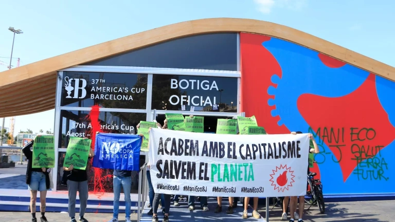 Una quarantena d'activistes han irromput aquest dimecres a la botiga de la Copa Amèrica de Vela a Barcelona, situada al Moll de les Drassanes, per denunciar aquesta competició i els macroprojectes que "trinxen el territori". L'acció ha estat promoguda pels col·lectius Futuro Vegetal, End Fossil, Arran i Fridays For Future, en coordinació amb la Plataforma No a la Copa Amèrica, com un acte previ a la manifestació ecologista del dissabte a Barcelona.
