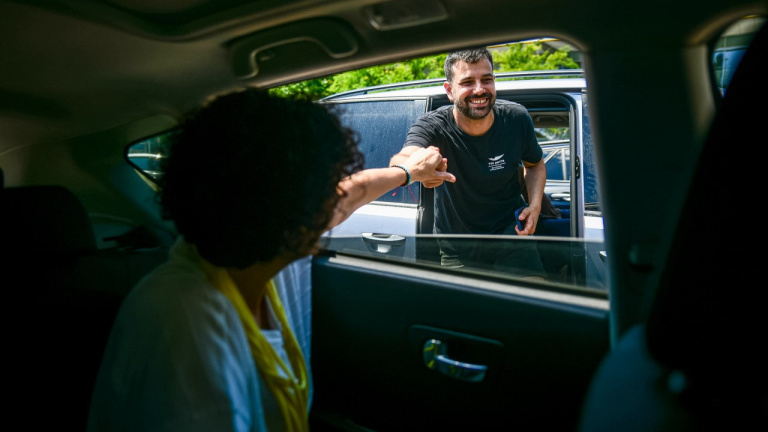 Marta Rovira i Ruben Wagensberg es saluden en el moment de pujar als cotxes de retorn cap a Catalunya aquest dijous. Marc Puig / ERC