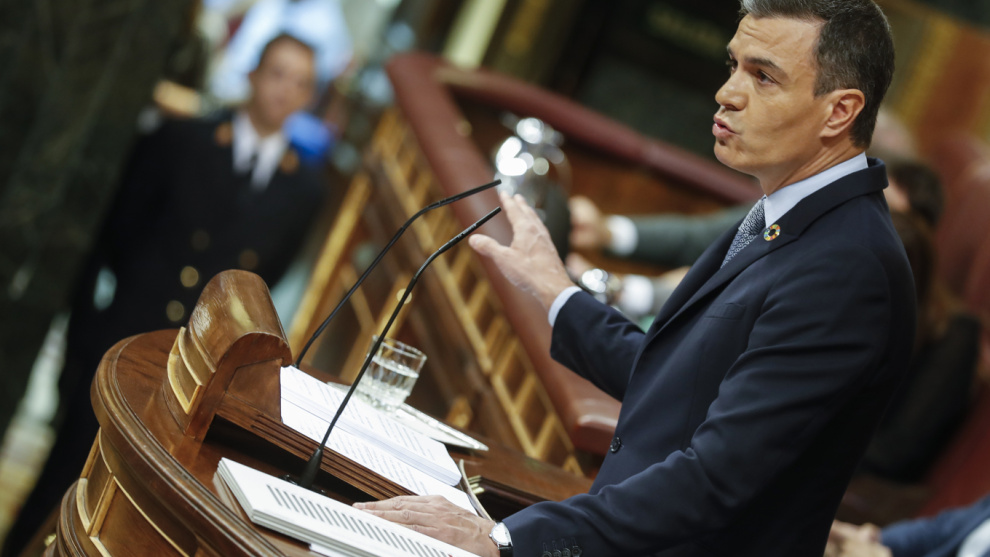 El president del Govern espanyol, Pedro Sánchez, durant la intervenció en el debat sobre l'estat de la nació, aquest dimarts al Congrés. Javier Lizon / EFE