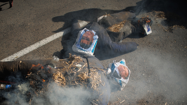 Los agricultores queman muñecos con las caras de Sánchez y Planas