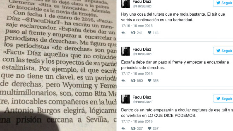 El mensaje, publicado el 10 de enero de 2015 (Ussía asegura que es del 1 de enero de 2016), forma parte de una serie de tres en los que Díaz decía lo siguiente: "Hay una cosa del tuiters que me mola bastante. El tuit que veréis a continuación es una barbaridad". "España debe dar un paso al frente y empezar a encarcelar a periodistas de derechas". "Dentro de un rato empezarán a circular capturas de ese tuit y se convertirán en LO QUE DICE PODEMOS".