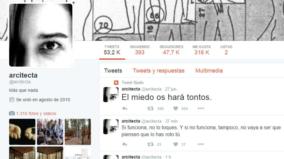 Así se describe @arcitecta, la tuitera que necesita "un doble para las escenas de madrugar" y que por la noche se acuesta como Dios la trajo al mundo: "sin entender nada". En su la red social reflexiona sobre tostadas y otros asuntos nimios de la vida con tanta destreza que ha encandilado a más de 47.000 seguidores, entre ellos Eva Hache, Berto Romero, José Luis Cuerda, Cayo Lara o Forges.