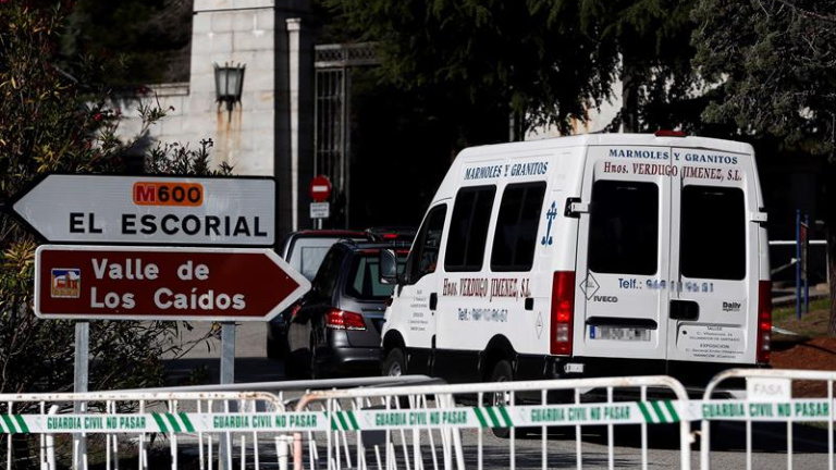 Este lunes el Valle de los Caídos está perimetrado y vallado con varios efectivos de la Guardia Civil que también restringen el paso a los ciudadanos. Pasadas las 11.00 horas de este lunes dos coches fúnebres entraron en el monumento con la autorización de las fuerzas y cuerpos de seguridad presentes.