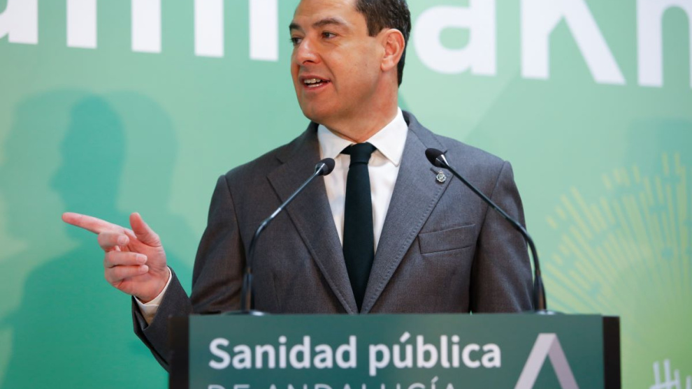 El presidente de la Junta, Juanma Moreno, durante su atención a medios en el Hospital Virgen de las Nieves de Granada, a 20 de enero de 2023. Álex Cámara / Europa Press