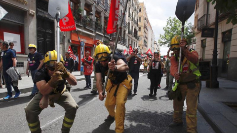 Numerosas asociaciones y sindicatos de bomberos forestales se han manifestado hoy en Madrid llegados de toda España para pedir al Gobierno la profesionalización del sector y un estatuto básico que defina su profesión a nivel nacional.
