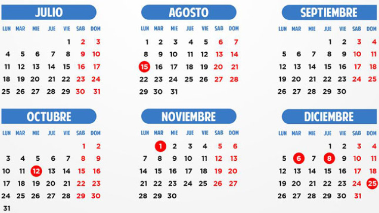Los ocho días festivos que coincidirán en toda España son los siguientes: 1 de enero (Año Nuevo, que cae en viernes), 6 de enero (miércoles, día de Reyes), 25 de marzo (Viernes Santo), el 15 de agosto (Asunción de la Virgen, lunes), 12 de octubre (Fiesta Nacional de España, miércoles), 1 de noviembre (Todos Santos, martes), 6 de diciembre (Día de la Constitución, martes) y 8 de diciembre (Inmaculada Concepción, jueves).