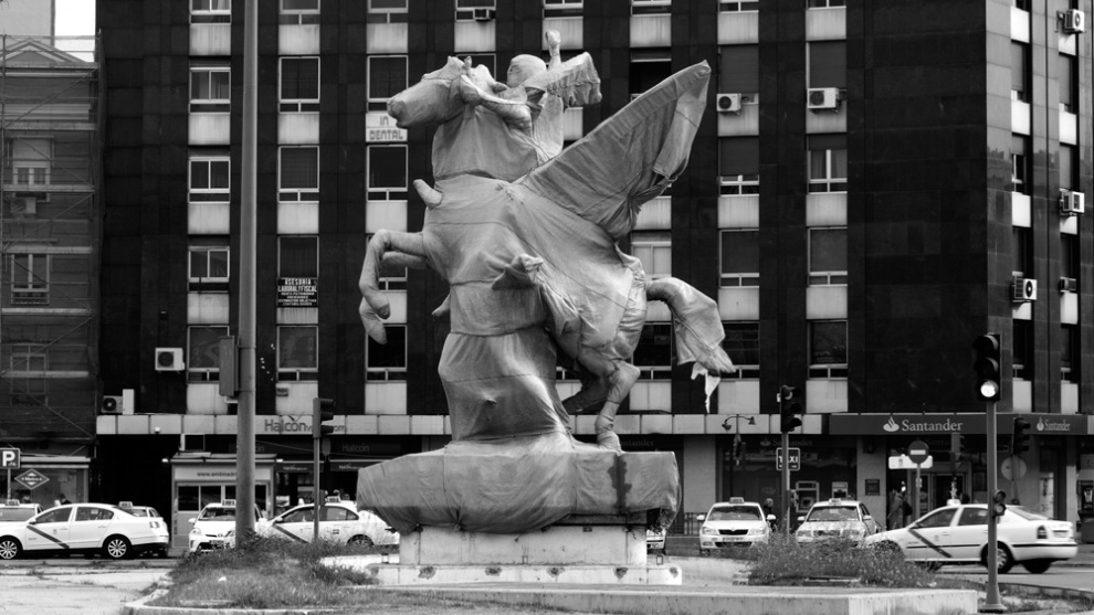 Aquí entra en acción el colectivo artístico El Banquete. “Nos sedujo un elemento de la urbe que destacaba por su anomalía: un monumento tapado. Parecía una obra de Christo”, recuerda Alejandro Cinque. Junto a Raquel G. Ibañez, Antonio Torres y Marta van Tartwijk, conforman un grupo de investigación y creación que lleva a cabo proyectos relacionados con la experiencia cotidiana como valor artístico. Su metodología de trabajo consiste en la relectura política del entorno diario. Para ellos, una escultura vendada y otra condenada al ostracismo ayudan a construir el relato contemporáneo de esta ciudad. Una ciudad en crisis.