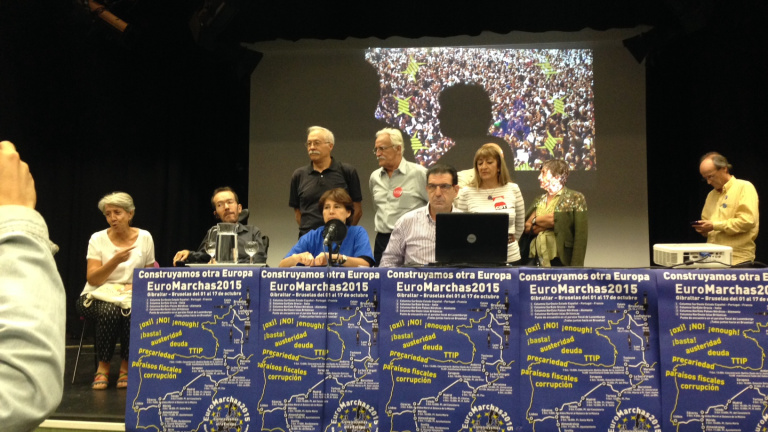 El secretario general de Podemos en Aragón ha acudido esta mañana a la rueda de prensa organizada por las Euromarchas, el colectivo formado por organizaciones sociales de algunos países de Europa –España, Portugal, Francia, Grecia, Italia, Países Nórdicos, Alemania y las islas británicas- que emprenderá su camino desde Gibraltar a Bruselas el 1 de octubre para reclamar a la Unión Europea un “giro radical” en sus políticas y la construcción de una Europa “solidaria y de las personas”, tal y como ha expresado una de sus portavoces, Liliana Pineda.