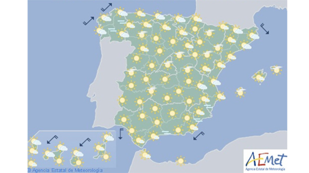 El viento soplará del suroeste en el litoral de Galicia, y del noreste en los litorales del sureste peninsular y Canarias. Flojo variable en el resto.