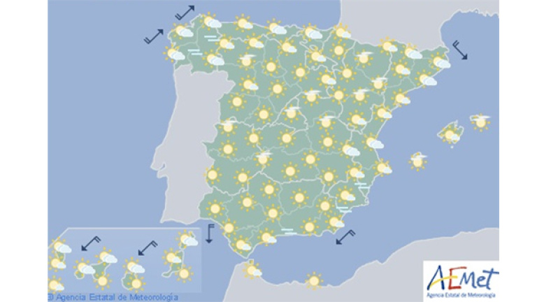 Las temperaturas descenderán en la mitad sur del área mediterránea, y ascenderán en el resto de la Península, y con pocos cambios en Baleares y Canarias.