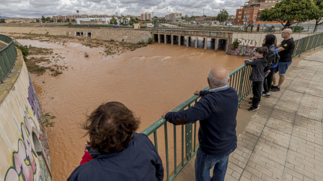 La influencia de la depresión aislada en niveles altos (DANA), que entró por el Golfo de Cádiz, continuará afectando a parte de la península, la peor parte la están sufriendo la Región de Murcia, el sur del País Valencià y Andalucía. Las precipitaciones registradas han afectado de manera especial a algunas zonas de los municipios de Cuevas de Almanzora (Almería), Campo de Cartagena y Valle del Guadalentín (Murcia), sin causar daños relevantes al dominio público hidráulico. En la imagen, varias personas observan desde el puente de Benipila de Cartagena los estragos de las inundaciones.
