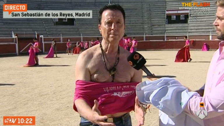 En su aparición llegó a quitarse la camisa para enfundarse una camiseta con el lema "sí a la fiesta taurina". También mostró las cicatrices de las cornadas que ha recibido a lo largo de su carrera: "Que no crean que solamente el toro es el que sufre, los toreros también", explicó.