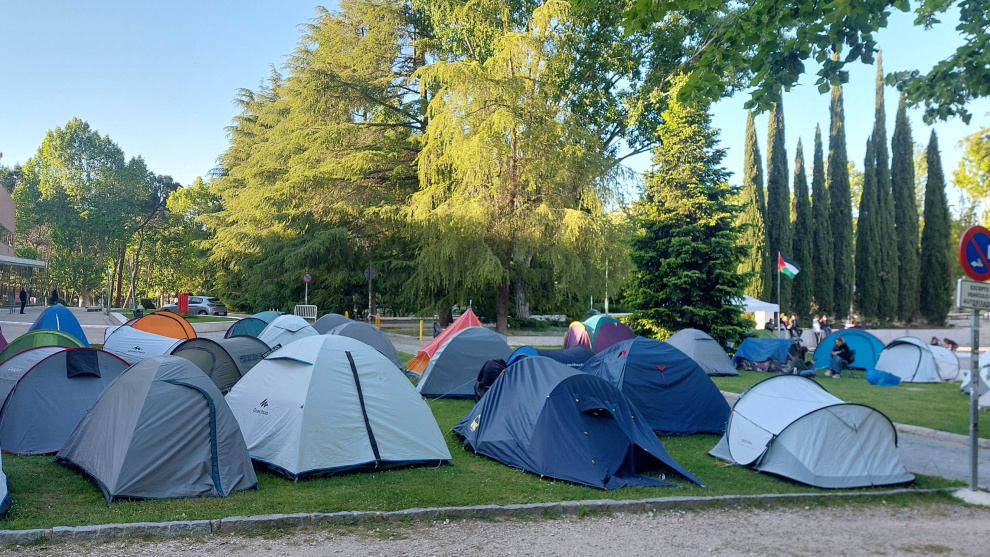Las tiendas de campaña se mantienen en la Universidad Complutense para protestar contra "la declaración de anexión de Gaza" y mostrar su rechazo "al rearme y al aumento de los presupuestos de guerra".