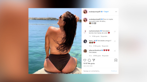 Anabel Pantoja cumple 34 años, la sobrina de la tonadillera está de aniversario en uno de los mejores momentos de su vida, tanto a nivel personal como a nivel profesional, y es que solo hay que verle la cara para darse cuenta de que está feliz. La colaboradora de televisión ha dado la bienvenida a los 34 con una fotografía que ha colgado en sus redes sociales, una publicación en la que aparece en topless y acompañada de un mensaje donde demuestra lo orgullosa que está de su cuerpo: "dice mi madre que parió hace 34 años…".