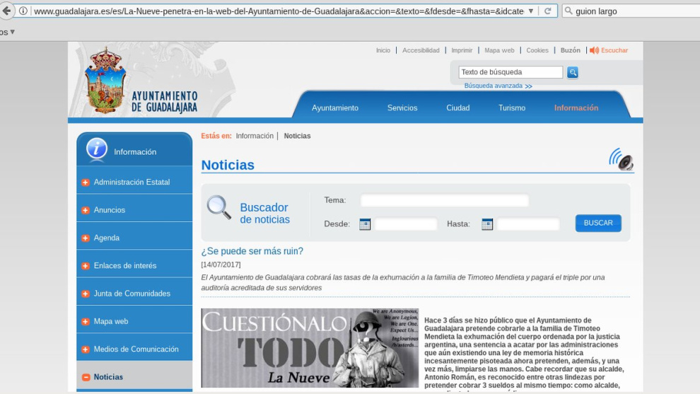 Un grupo de hackers vinculado a Anonymous, y que lleva por nombre La Nueve, ha conseguido acceder a los servidores de la web del Ayuntamiento de Guadalajara para publicar una entrada contra su alcalde (PP), después de que este intentase cobrar la exhumación de Timoteo Mendieta.