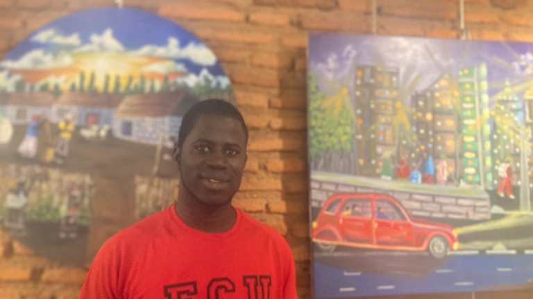 El senegalés, que vino en patera en el año 2019, se busca la vida como artista en Lepe. Tiene una obra muy personal, única.