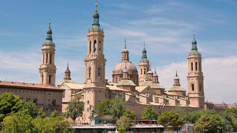La construcción del actual Pilar, declarada catedral en 1675, comenzó tras el incendio en 1434 de la iglesia románica original sobre la que se levanta y fue consagrada en 1872, aunque la última torre no fue terminada hasta 1961, más de cinco siglos después del inicio. El edificio, en cuyas obras intervinieron arquitectos como Francisco de Herrera y Ventura Rodríguez, incluye frescos de Goya.
