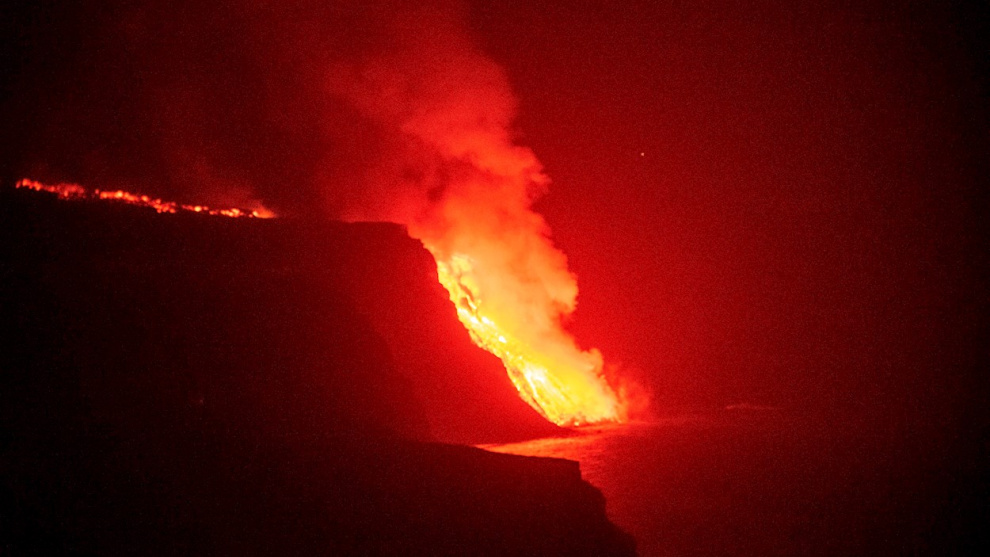 La colada de lava del volcán en La Palma ha alcanzado el mar a medianoche, pocos minutos después de las 23.00 (hora canaria). En concreto lo ha hecho en Tazacorte, en el entorno de la playa de Los Guirres, en su zona norte, donde se precipita de un acantilado de cerca de 100 metros de altura. El mar tiene poca profundidad en esa zona.