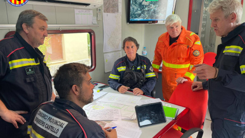 Las autoridades trabajan para evitar que ambos focos se unen en un gran fuego que arrase el parque natural y su biodiversidad. En la imagen varios dirigentes del plan de emergencia trabajan para diseñar una estrategia, a 18 de agosto de 2022.