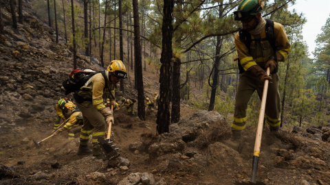 Personal del operativo Brifor realizan labores de perimetrado de puntos calientes en la zona de El Lagar, en el municipio de La Guancha, en el incendio que afecta dese ayer a la isla de Tenerife.